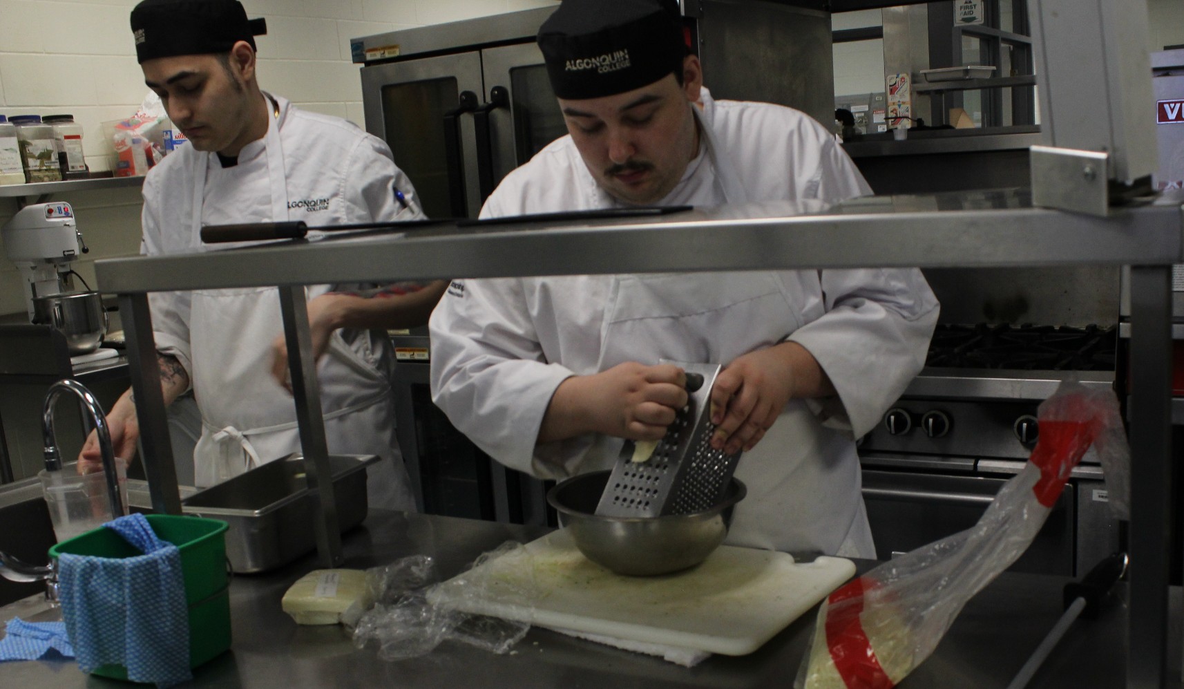 An Algonquin College culinary student grating cheese. Photo credit: Pedro Mendez
