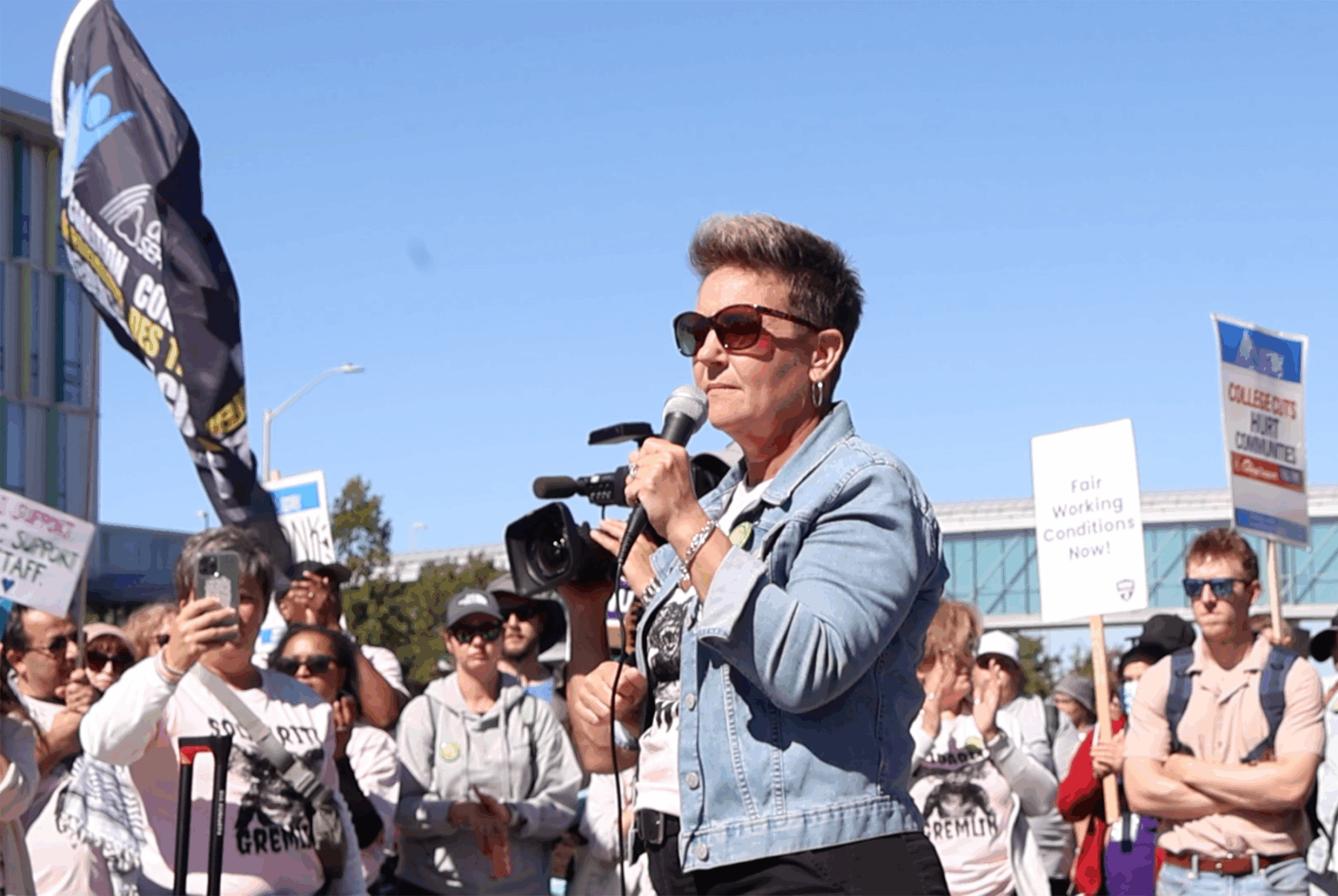 In her speech, Algonquin College professor and president of OPSEU Local 415 Tracey Henderson argued that the “crisis” was “manufactured.”