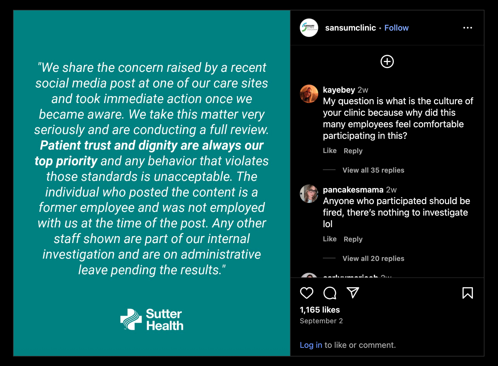 In response to the scandal, Sansum Clinic released a statement claiming the person who made the TikTok was not employed at the time of the post and that all staff shown in the photos were placed on administrative leave pending the conclusion of their internal investigation.