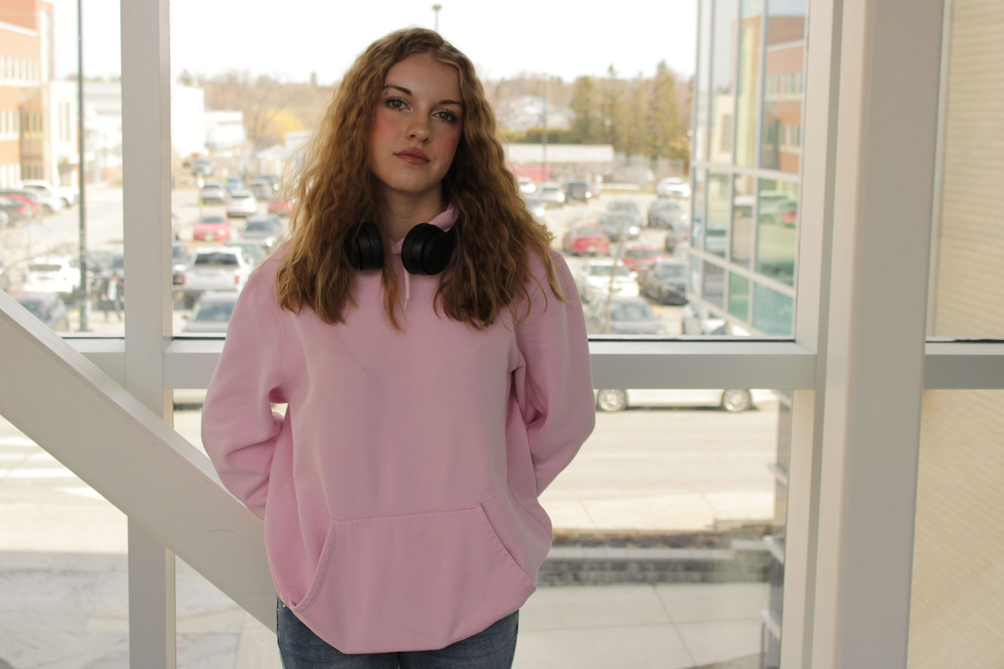 Gabriela Malecki poses at Algonquin College wearing an oversized H&M hoodie, part of her “sandwich method” for building a comfortable lazy-day outfit. Photo credit: Sienna Gauthier