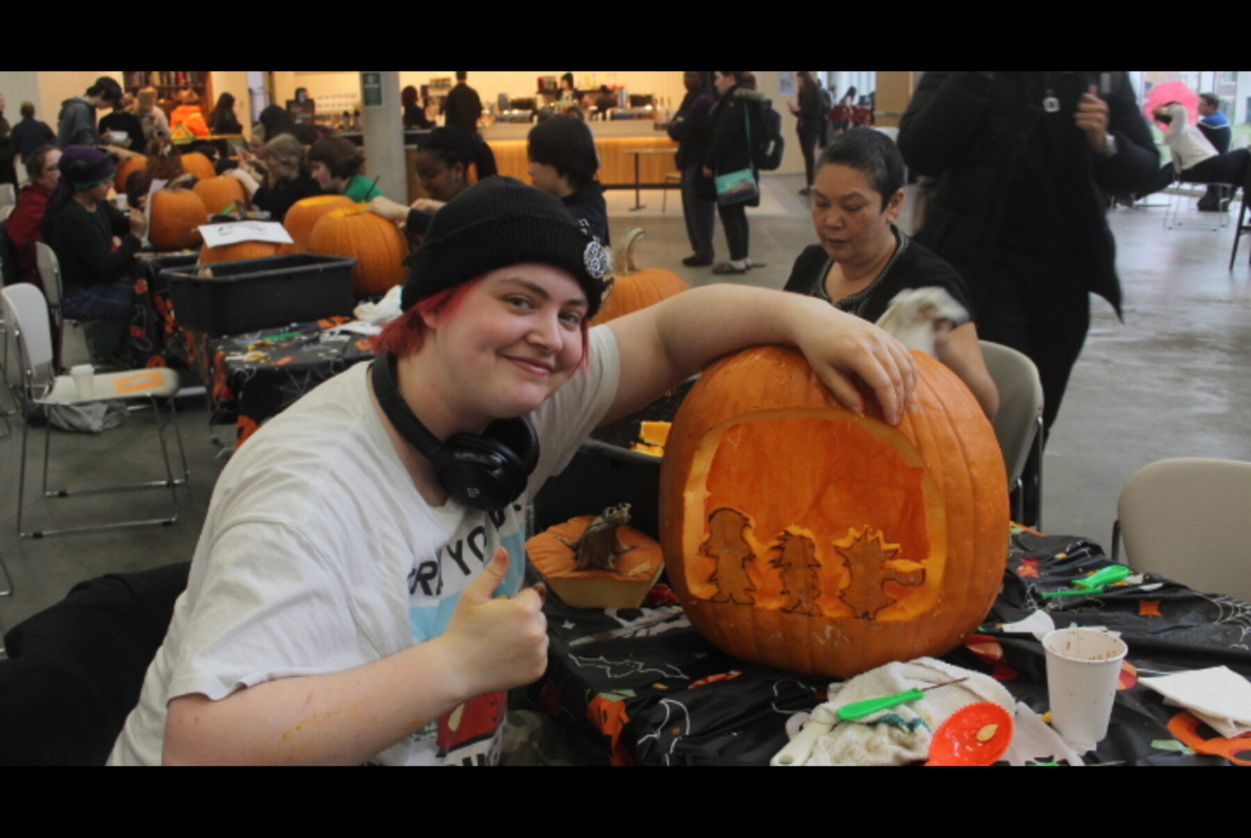 Nine tables were spread out with carving tools and each had a bin for people to scoop out and dump their pumpkin insides. Students could sit with friends or join new tables to carve alongside others.